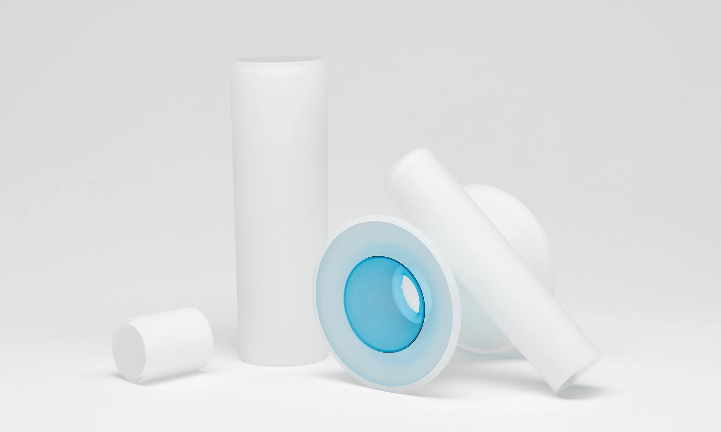 My interest in play and the inviting qualities of glass are strong motifs throughout my work. Using hot glass I am directly contradicting the delicate and fragile material in which the objects are created by inviting engagement and interaction, at the same time, exploring form, texture and the illusion of space. The play of light and shadow and the optical qualities of solid glass evoke a childlike intrigue. Minimal objects come together in various ways to create narratives imagined by the viewer. My decision making in how to place these objects is not only for aesthetics reasons. Physically balancing pieces together gives the appearance of a game in play that the viewer can become a part of.